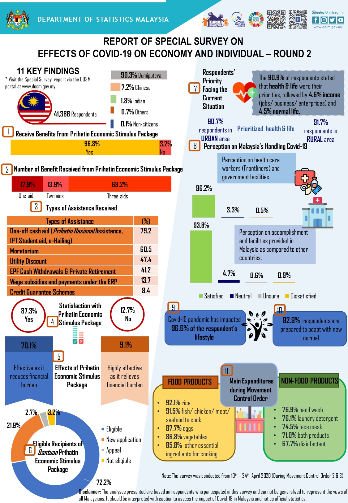 This report provides a summary of findings Special Survey ‘Effect of Covid-19 on the Economy and Individual' - Round 2, was conducted online by the Department of Statistics, Malaysia for the period 10 - 24 April 2020. This survey consists of 4 modules and 36 questions. A total of 41,386 respondents aged 15 years and above has participated in this survey. The analysis presented are based on respondent’s feedback that includes qualitative personal opinion on economics, employment, life style and education.