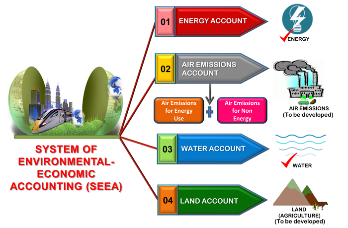 The Roadmap SEEA for Malaysia 2016-2020 is a dynamic document that outlined policies/programmes/initiatives related to environment in Malaysia, governance structure, data requirements, proposed accounts and implementation strategies as well as critical success factors for SEEA implementation. This Roadmap identified four potential SEEA accounts that could be developed in Malaysia namely energy, water, air emission (for energy use) and land accounts (agriculture).