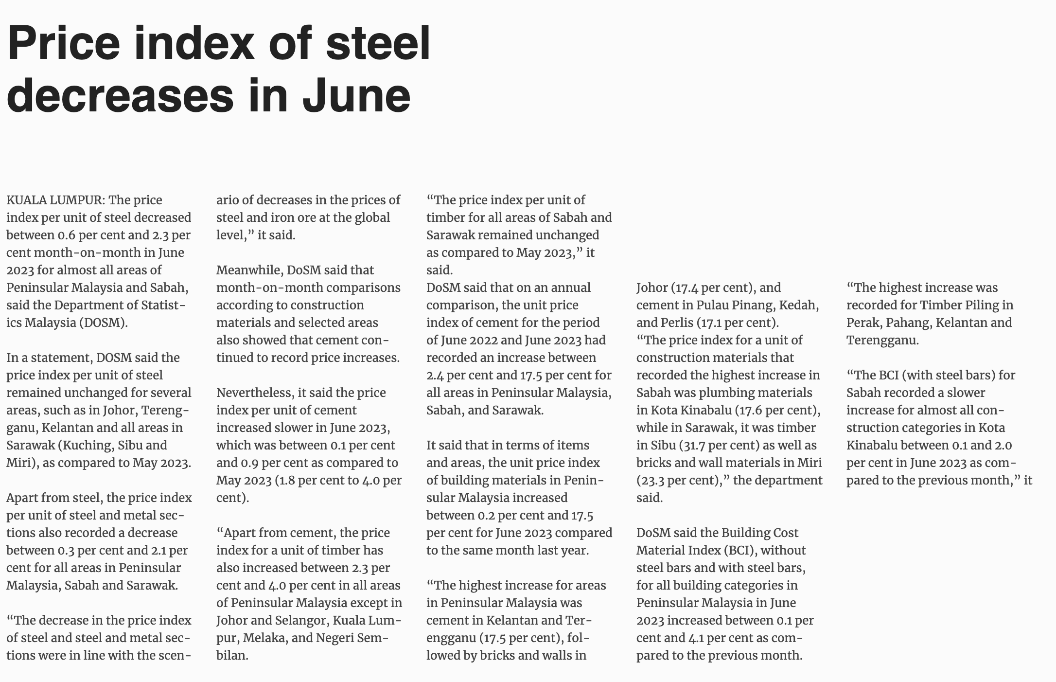 Price index of steel down in June