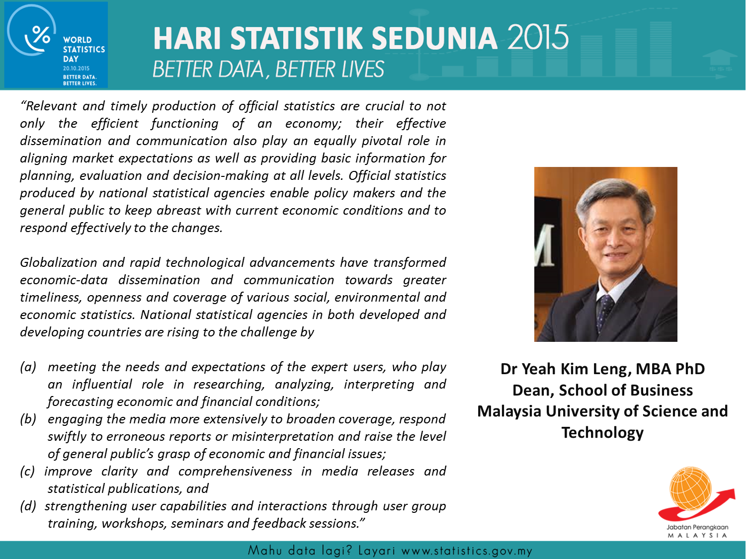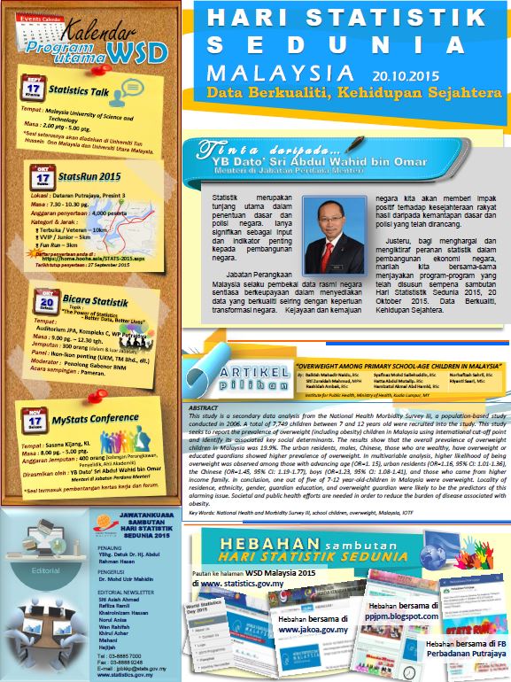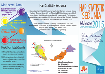 Department of Statistics, Malaysia and the participating partners from other government agencies, universities and private sector will organise programmes to commemorates World Statistics Day 2015 celebration. The World Statistics Day 2015 organising committee includes: