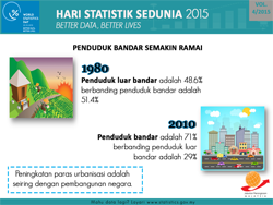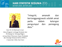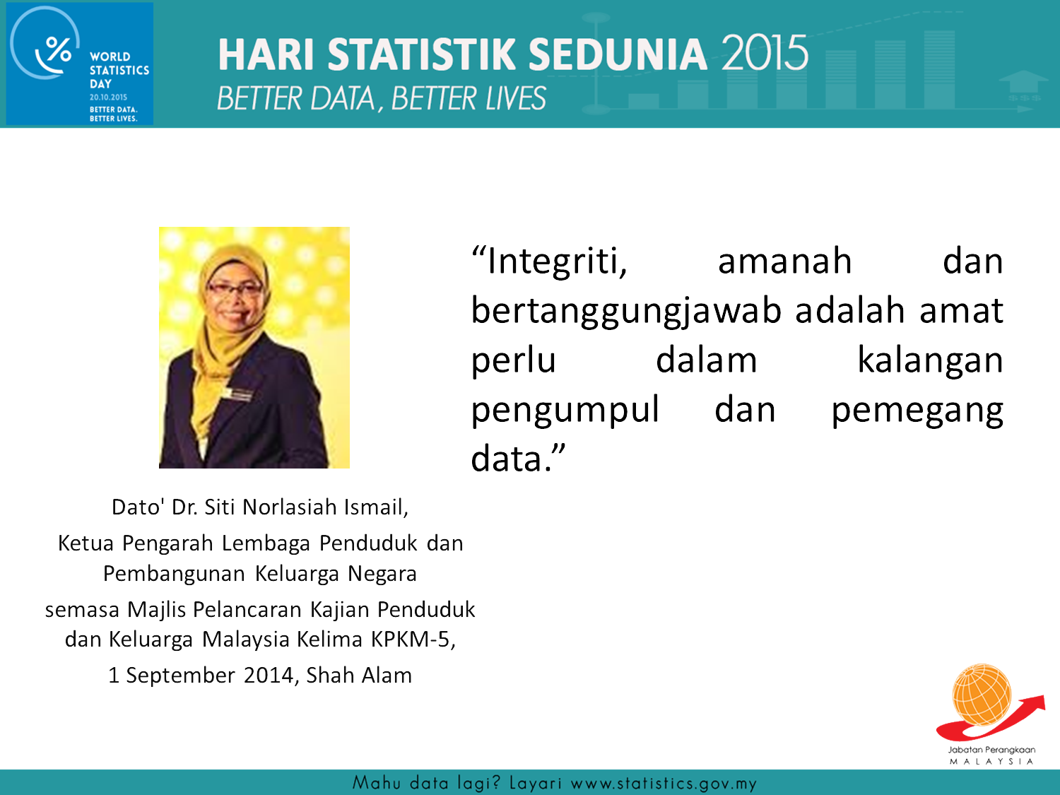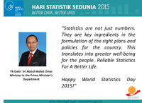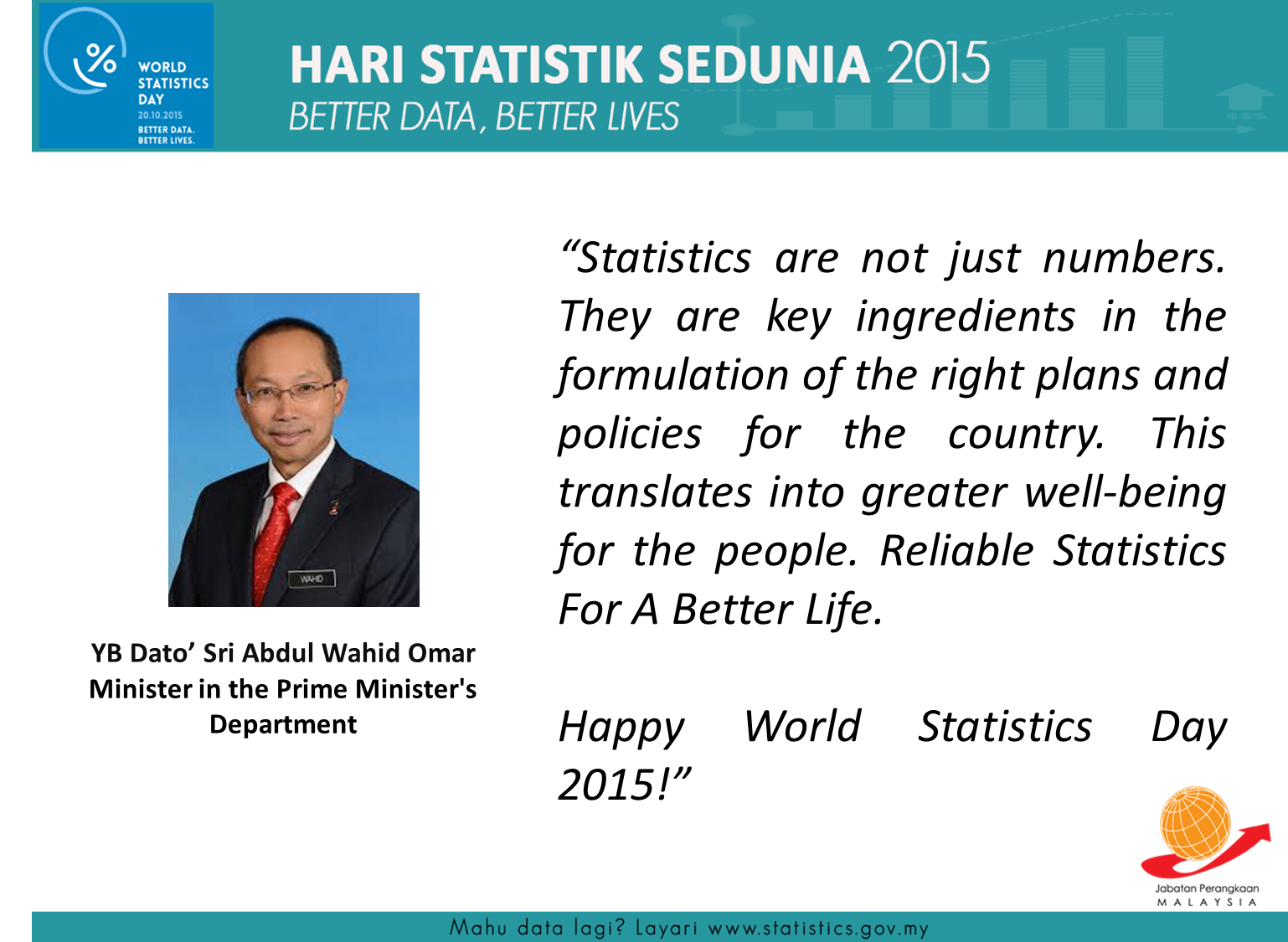 The United Nations General Assembly adopted on 3 June 2010 which officially designated 20 October 2010 as the first ever World Statistics Day under the theme “Celebrating the Many Contributions and Achievements of Official Statistics”. The first World Statistics Day (20-10-2010) was celebrated in over 130 countries and areas including Malaysia, to raise awareness of the many achievements of official statistics premised on the core value of service, professionalism and integrity. On 3 June 2015, the United Nations General Assembly adopted a resolution officially designating 20 October 2015 as the second World Statistics Day, under the general theme “Better data. Better lives”. In addition, the General Assembly decided to celebrate World Statistics Day on 20 October every five years. This programme is conducted to celebrate the many achievements of official statistics and the core values of service, integrity and professionalism, while recognizing that each country may develop its own national theme, taking into account national priorities and circumstances.