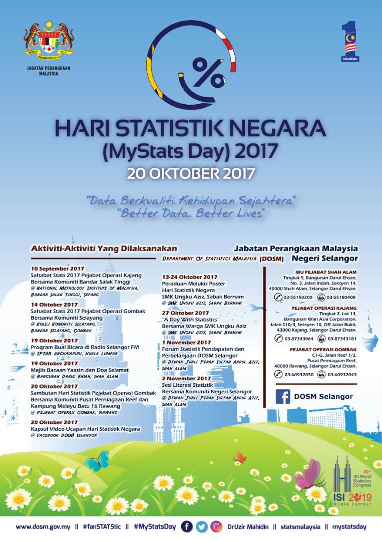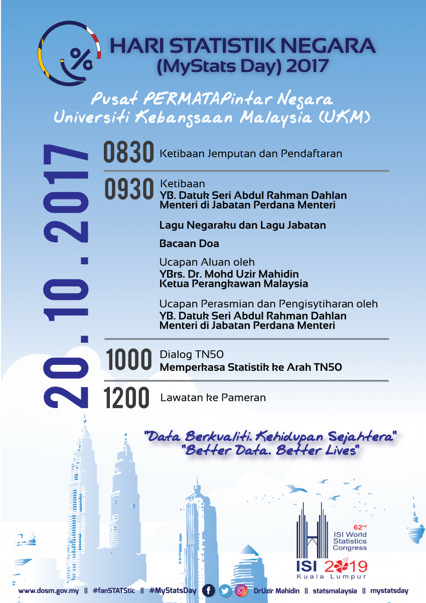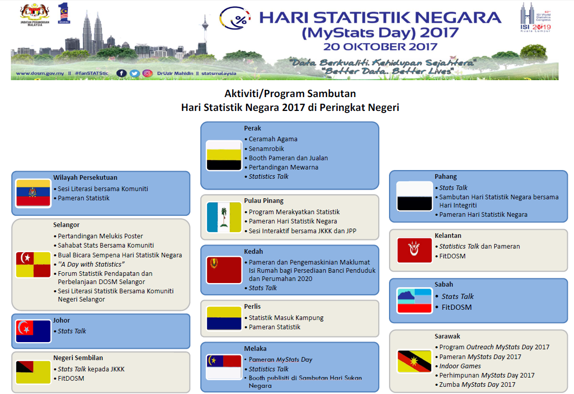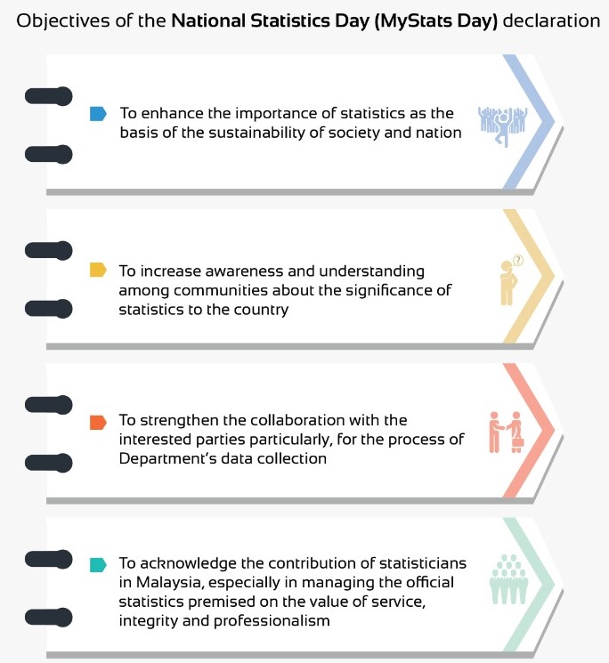 National Statistical Office (NSO) or official statistics agency for every country in the world always provided comprehensive information towards the development of their respective countries. Provided statistics can give the best direction in measuring the country progress, especially to policymakers, for instance, in monitoring Sustainable Development Goals (SDGs) indicators at national, regional and international levels. As a matter of fact, the 64th United Nations General Assembly (UNGA) has declared the World Statistics Day to be celebrated on 20 October 2010. The objective of this celebration is to glimpse through the history of world’s official statistic development and the role of the United Nations Statistical Commission (UNSC) since its establishment in 1947. World Statistics Day has been celebrated in 103 countries including Malaysia. Subsequently, the 69th UNGA has set the 2nd World Statistics Day on 20 October 2015 and will celebrate every five years on 20 October. Accordance with UNGA's resolution, World Statistics Day celebration in Malaysia has been celebrated since 2010 by organizing activities that involved various levels of community. Declaration of National Statistics Day will celebrate annually in tandem with the celebration at global, regional as well as other countries. Several countries also held the celebration of the National Statistics Day every year such as the Republic of Slovenia (24 January), India (29 June), Qatar (12 October), the European Union (20 October), Bermuda (October) and Africa (18 November). Meanwhile, Philippines held a National Statistics Month celebration in October each year. Various programmes have been prepared with the involvement of international and local stakeholders.