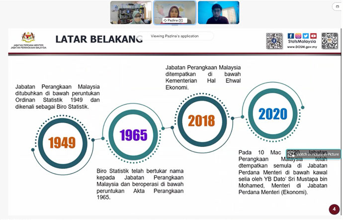 Pihak DOSM telah dijemput untuk membentangkan topik berkaitan 'Pendapatan dan Perbelanjaan Isi Rumah serta Kemiskinan' dalam forum 'Industry in the Classroom' anjuran Fakulti Perniagaan, Ekonomi dan Pembangunan Sosial, Universiti Malaysia Terengganu (UMT) yang disampaikan oleh Puan Pazlina Waty Che Pah, Bahagian Perangkaan Harga, Pendapatan dan Perbelanjaan (BPHPP) pada jam 11.00 pagi tadi secara dalam talian.