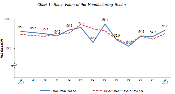 The sales value of the Manufacturing sector in August 2015 increased by 0.8% (RM0.4 billion) to record RM56.2 billion as compared to RM55.8 billion reported a year ago (Chart 1). Meanwhile, month-on-month basis, the sales value increased by 3.9% (RM2.1 billion) compared with the preceding month. The sales value in July 2015 has been revised based on latest data available. |