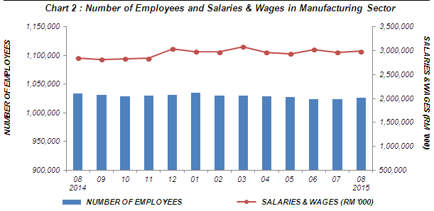 Total employees engaged in the Manufacturing sector in August 2015 was 1,026,543 persons, a decrease of 0.6% or 6,704 persons as compared to 1,033,247 persons in August 2014 (Chart 2). Meanwhile, month-on-month basis, the number of employees increased by 0.3% as compared to 1,023,816 persons in the preceding month. |