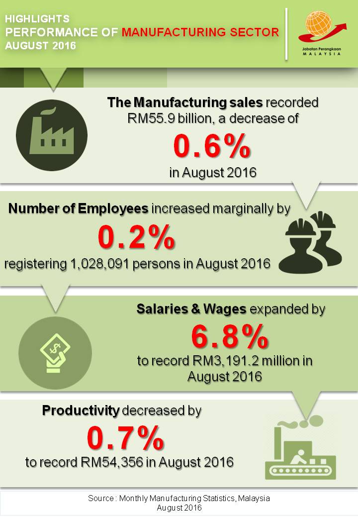 The sales value of the Manufacturing sector in August 2016 recorded RM55.9 billion, a decrease of 0.6% (RM0.3 billion) as compared to RM56.2 billion reported a year ago.