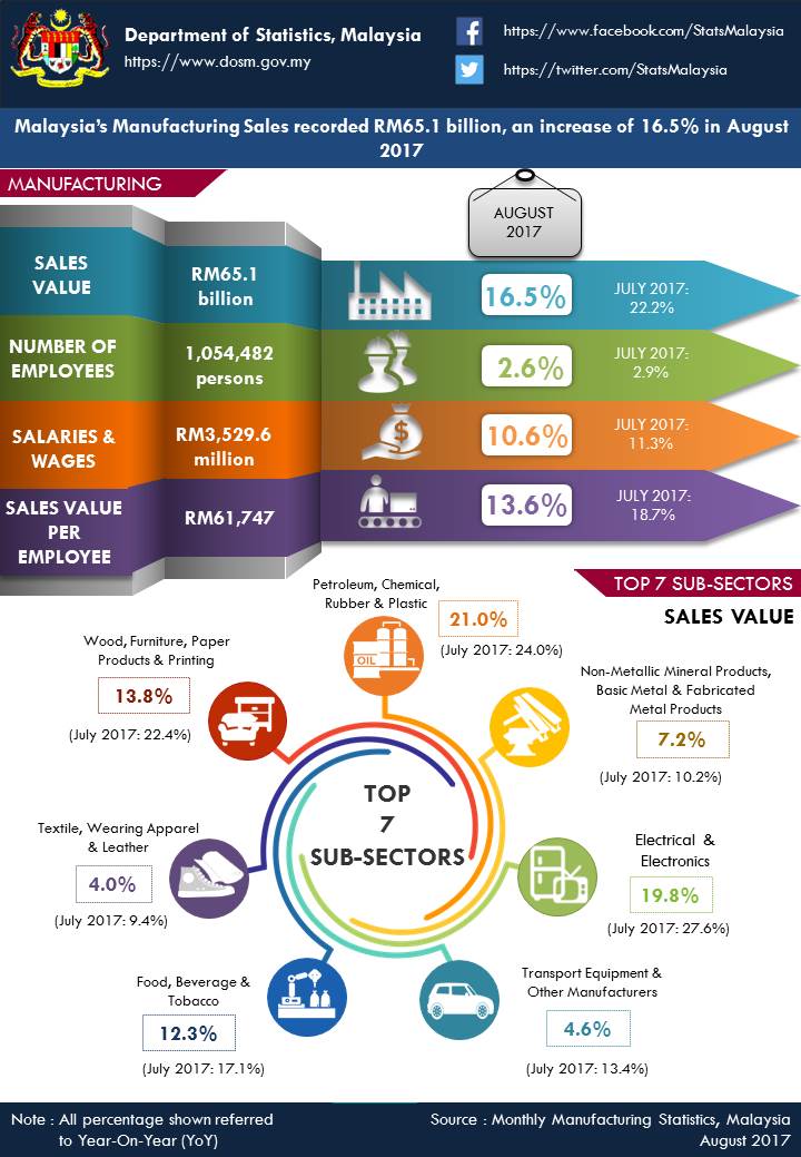 Manufacturing sector registered a sales value of RM65.1 billion in August 2017