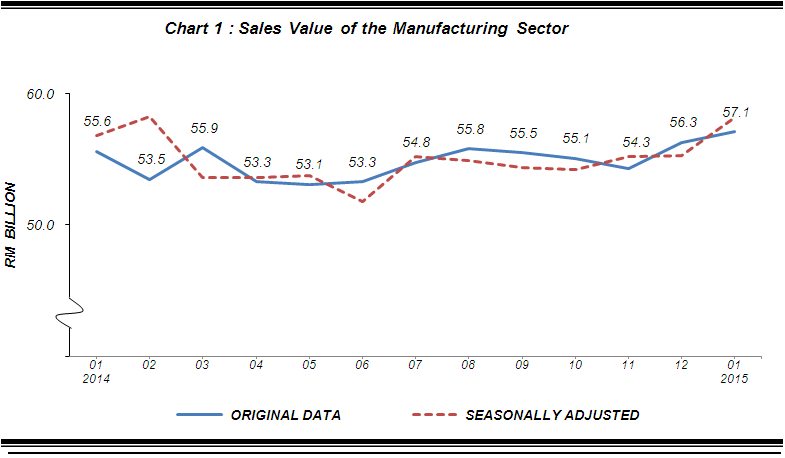 The sales value of the Manufacturing sector in January 2015 rose 2.7% (RM1.5 billion) to record RM57.1 billion as compared to RM55.6 billion reported a year ago. Meanwhile, month-on-month basis, the sales value has increased by 1.5% (RM0.8 billion) compared with the preceding month. The sales value in December 2014 has been revised based on latest data available. |