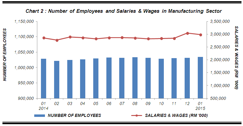 Total employees engaged in the Manufacturing sector in January 2015 was 1,034,193 persons, an increase of 0.5% or 5,629 persons as compared to 1,028,564 persons in January 2014. Meanwhile, month-on-month basis, the number of employees increased by 0.3% compared with the preceding month. The total employees in December 2014 has been revised to record 1,031,226 persons. |