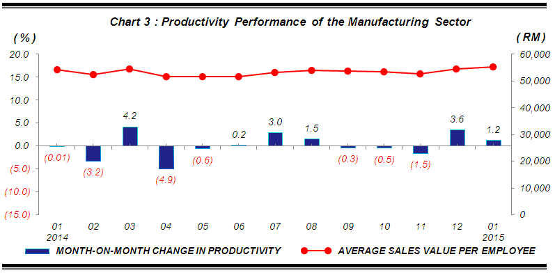 Productivity or average sales value per employee in January 2015 rose 2.1% as compared with the same month of the previous year. Meanwhile, productivity in January 2015 has increased by 1.2% month-on-month to register RM55,255. Productivity in December 2014 has been revised to RM54,589. |