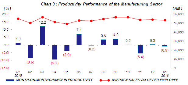 Productivity or average sales value per employee in January 2016 decreased by 3.0% as compared with the same month of the previous year. Meanwhile, productivity in January 2016 decreased by 0.9% month-on-month to register RM53,653 (Chart 3). |