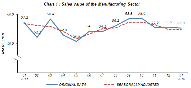 The sales value of the Manufacturing sector in January 2016 decreased by 3.4% (RM1.9 billion) to record RM55.3 billion as compared to RM57.2 billion reported a year ago (Chart 1). Meanwhile, month-on-month basis, the sales value decreased by 0.6% (RM0.3 billion) compared with the preceding month. The sales value in December 2015 remained unchanged. |