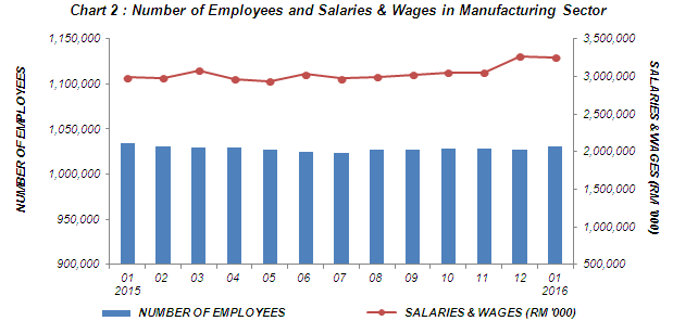 Total employees engaged in the Manufacturing sector in January 2016 was 1,030,153 persons, a decrease of 0.4% or 4,436 persons as compared to 1,034,589 persons in January 2015 (Chart 2). Meanwhile, month-on-month basis, the number of employees increased by 0.3% as compared to 1,027,044 persons in the preceding month. |