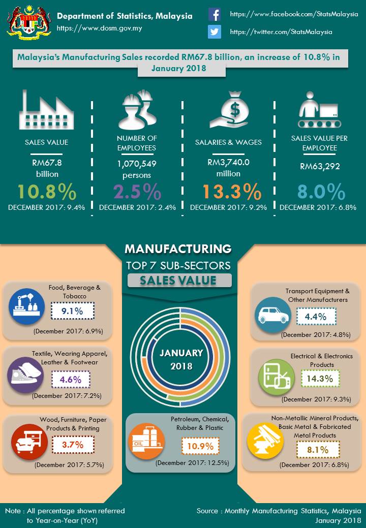 Year-on-year, the significant increase in sales value in January 2018 was due to the increase in Electrical and Electronic Products (14.3%), Petroleum, Chemical, Rubber and Plastic Products (10.9%) and Non-metallic Mineral Products, Basic Metal and Fabricated Metal Products (8.1%). These three sub-sectors contributed 80.2 per cent to the sales value of the manufacturing sector.