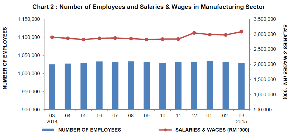 Year-on-year basis, salaries & wages paid in March 2015 has increased by 6.4% (RM185.1 million) as compared with the corresponding month of the previous year. Meanwhile, month-on-month basis, the total amount paid in March 2015, has increased by 3.6% (RM107.5 million) to register RM3,081.4 million. |