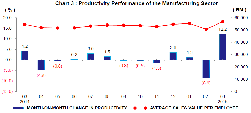 Productivity or average sales value per employee in March 2015 grew by 4.0% as compared with the same month of the previous year. Meanwhile, productivity in March 2015 has increased by 12.2% month-on-month to register RM56,718. Productivity in February 2015 has been revised to RM50,549. |