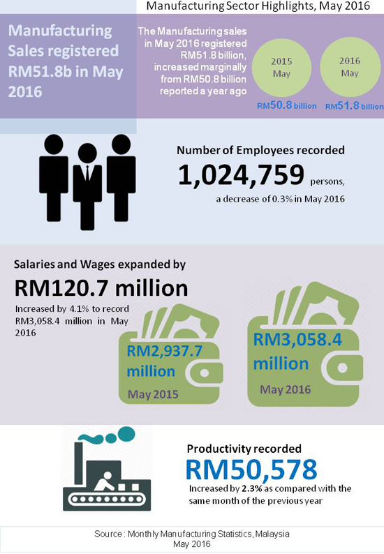 The sales value of the Manufacturing sector in May 2016 increased marginally by 2.0% (RM1.0 billion) to record RM51.8 billion as compared to RM50.8 billion reported a year ago.