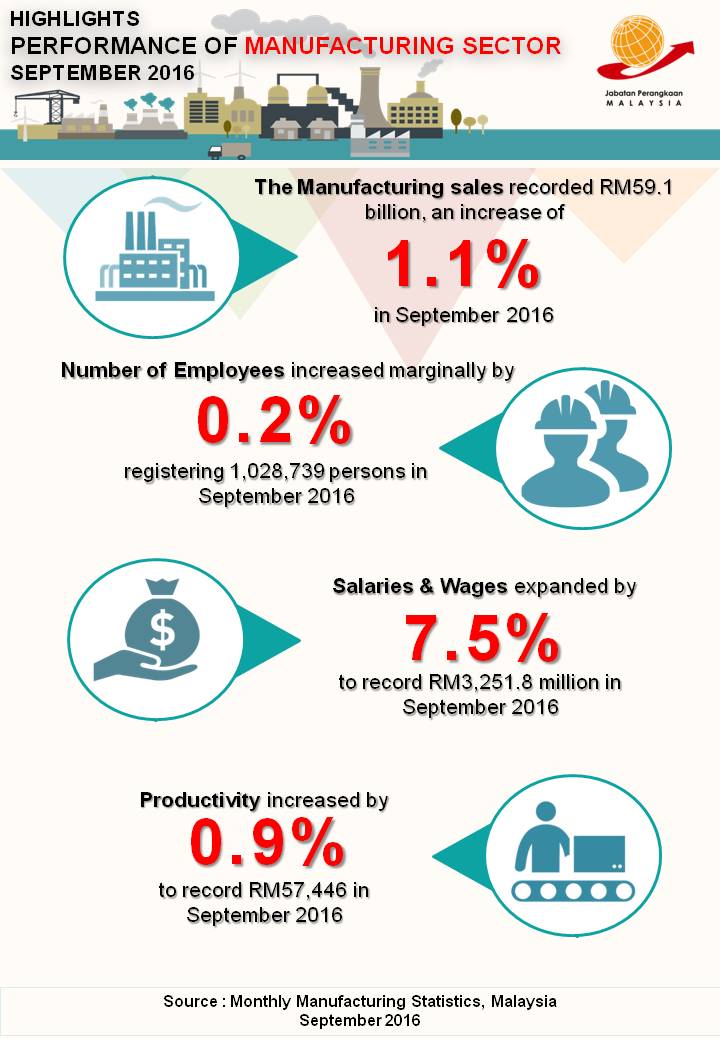 The sales value of the Manufacturing sector in September 2016 recorded RM59.1 billion, an increase of 1.1% (RM0.6 billion) as compared to RM58.5 billion reported a year ago.
