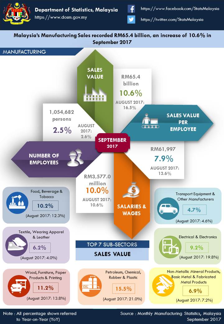 Year-on-year, the significant increase in sales value in September 2017 was due to the increase in Electrical and Electronic Products (9.2%), Petroleum, Chemical, Rubber and Plastic Products (15.5%) and Non-metallic Mineral Products, Basic Metal and Fabricated Metal Products (6.9%). These three sub-sectors contributed 80.6 per cent to the sales value of the manufacturing sector.