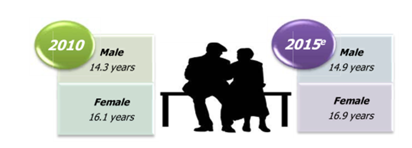 For males who reach the age of 65 years in 2015, is expected to live for another 14.9 years, increased by 0.6 years as compared to 2010. Similarly, females were expected to live for another 16.9 years increased by 0.8 years as compared to 16.1 years in 2010.