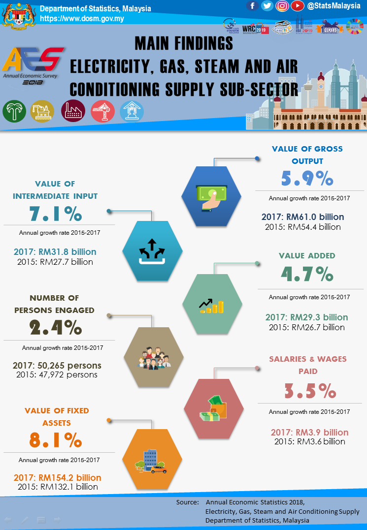 The electricity, gas, steam and air conditioning supply sub-sector recorded a value of gross output RM61.0 billion in 2017 as compared to RM54.4 billion in 2015 with an annual growth rate of 5.9 per cent. Meanwhile, the value of intermediate input showed RM31.8 billion, resulting in value added of RM29.3 billion. The number of persons engaged in this sub-sector was 50,265 persons with salaries & wages paid, RM3.9 billion. Meanwhile, the value of fixed assets was RM154.2 billion.