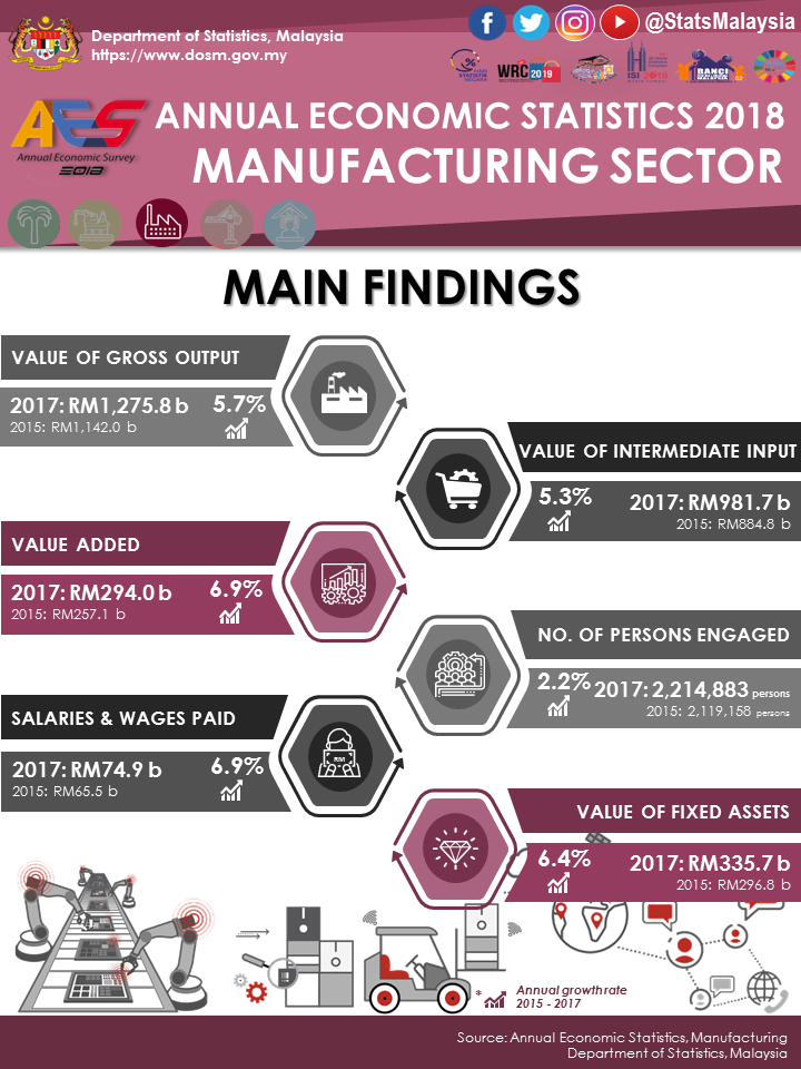 This report presents statistics derived from the Annual Economic Survey 2018 for the reference year 2017 in Manufacturing sector. The manufacturing sector includes all industries under Section C classified in the Malaysia Standard Industrial Classification (MSIC) 2008 Ver. 1.0, in accordance with the International Standard Industrial Classification of All Economic Activities (ISIC), Revision 4. Principal statistics such as value of gross output, intermediate input, value added, the number of persons engaged, salaries & wages paid and value of fixed assets are published in this report.