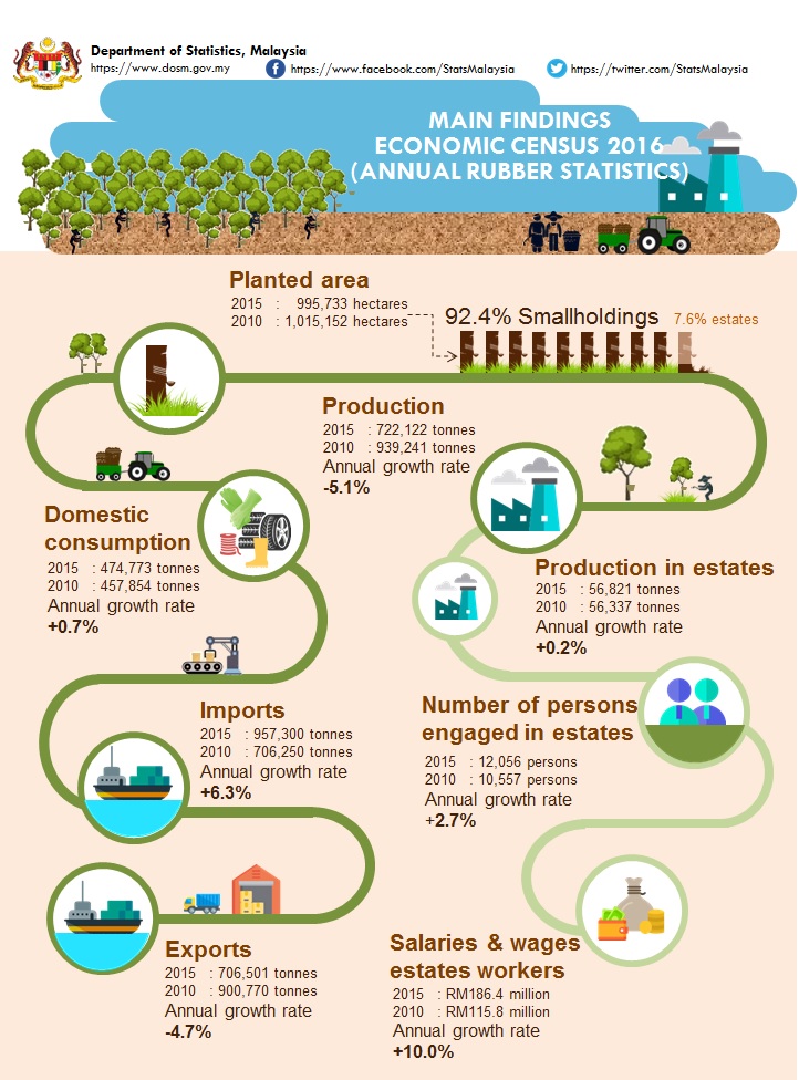 In 2015, the production of natural rubber was 722,122 tonnes as compared to 939,241 tonnes in 2010 with an annual growth rate of -5.1 per cent. Smallholding sector was the main contributor to the production of natural rubber at 665,301 tonnes or 92.1 per cent of the total production while 7.9 per cent was from estate sector.