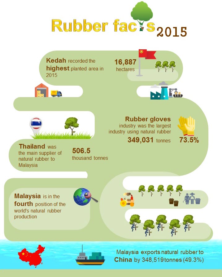 Domestic consumption of natural rubber in 2015 was 474,773 tonnes. Rubber glove industry was the largest industry using natural rubber of 349,031 tonnes (73.5%).