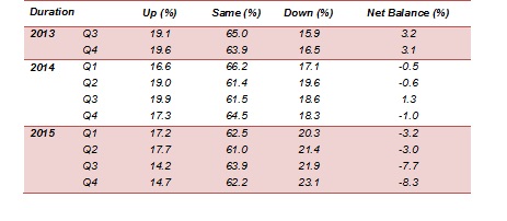 Table 2: Net Balance of Current Situation for Business Performance, 2013-2015