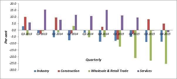 At sectors level, business current situation of industry, wholesale & retail trade and services has deteriorated during the fourth quarter 2015 with a net balance of -8.6 per cent, -25.4 per cent and -1.4 per cent respectively. In contrast, the construction sector has reported a better net balance of +5.0 per cent (Chart IV).