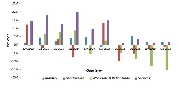 The business performance by sector shows the industry and services sectors are expected to grow in the first quarter of 2016 with confidence indicator +1.8 per cent and +1.7 per cent respectively. However, the business performance of construction and wholesale & retail trade sectors are expected to drop with confidence indicator -1.5 percent and -15.2 percent respectively (Chart II).