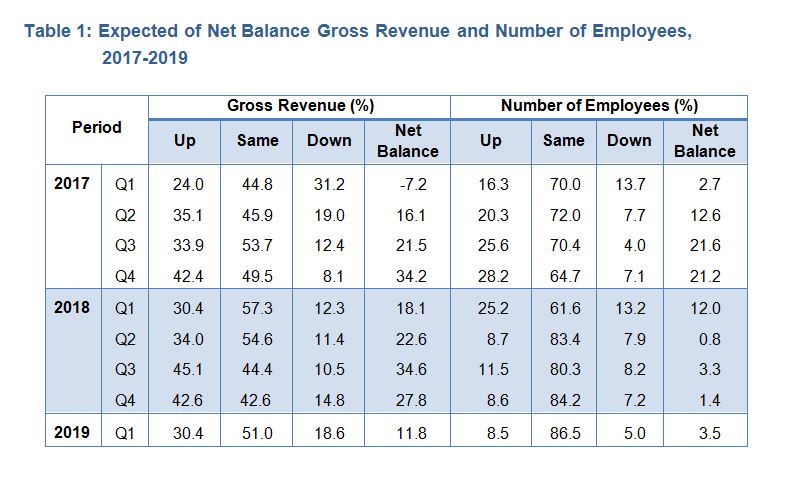 Overall, respondents expect gross revenue to increase in the first quarter of 2019 with a net balance of +11.8 per cent. A total of 30.4 per cent of the respondents anticipate that their gross revenue to increase while 51.0 per cent expected unchanged. In contrast, 18.6 per cent of the respondents foresee a decrease in gross revenue.