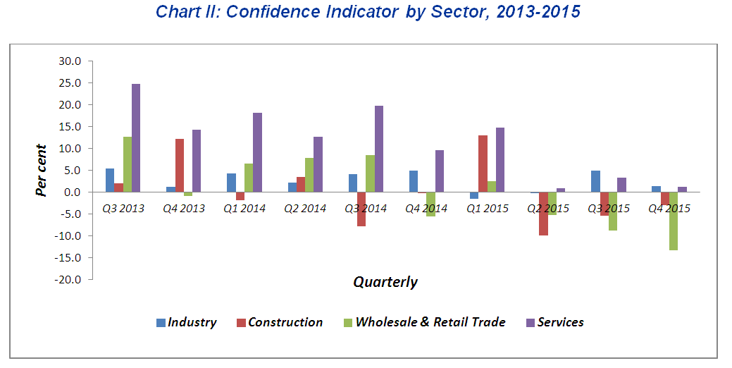 The business performance by sector shows the industrial and services sectors are expected to grow in the fourth quarter of 2015 with confidence indicator +1.4 per cent and +1.2 per cent respectively. However, the business performance of the wholesale & retail trade and construction sectors is expected to drop with confidence indicator -13.2 percent and -2.9 percent respectively. (Chart II)