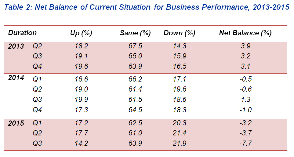 This report publishes the statistics of current business situation for the third quarter of 2015, business expectation for the fourth quarter of 2015 and the upcoming six months period of October 2015 to March 2016.