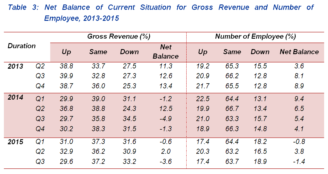 A total of 29.6 per cent of establishments reported an improvement in their business gross revenue. In contrast, 33.2 per cent of establishments have reported deterioration in their gross revenue condition and 37.2 per cent of establishments stated their gross revenue remain the same in the third quarter of 2015. This translates to a net balance of -3.6 per cent as compared to +2.0 per cent in the previous quarter.
