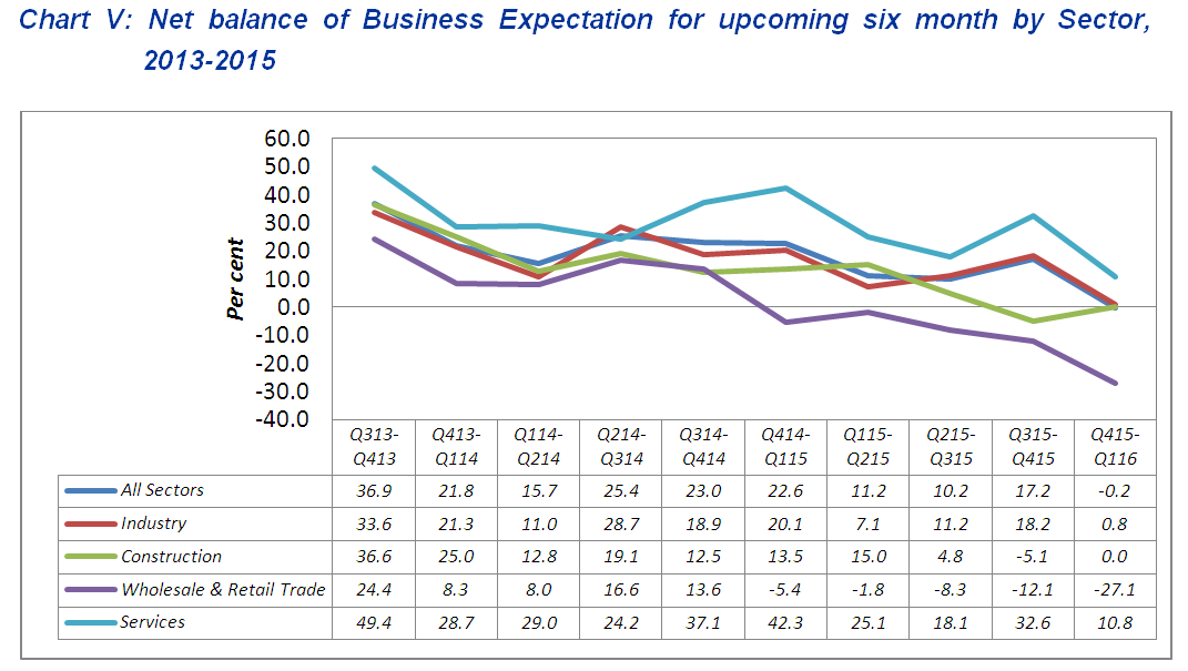 At sectors level, business current situation of wholesale & retail trade, industry and services has deteriorated during the third quarter 2015 with a net balance of -22.9 per cent, -8.9 per cent and -0.2 per cent respectively. In contrast, the construction sector has reported a better net balance of +8.3 per cent (Chart IV).