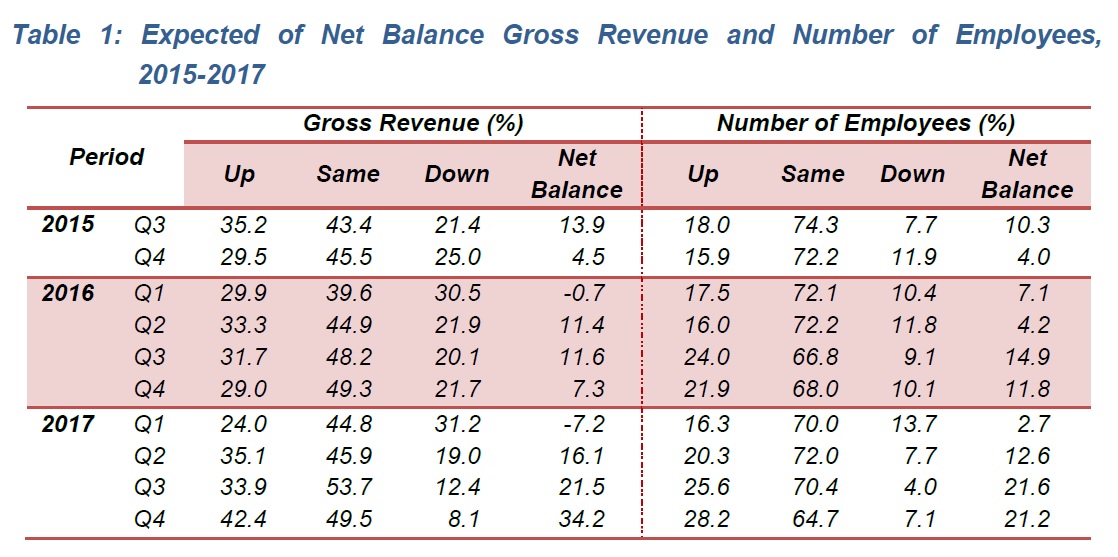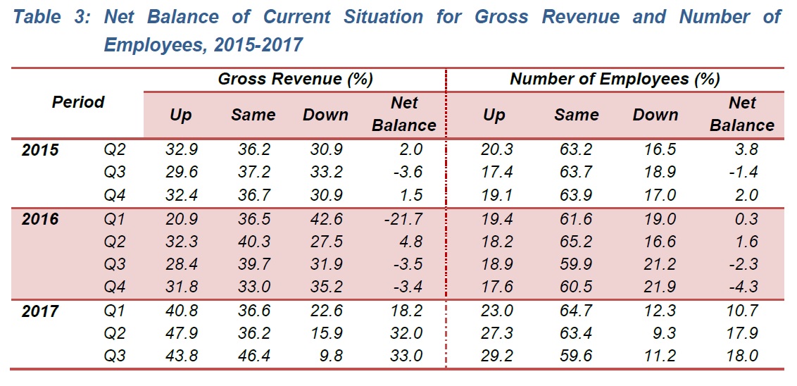 In the third quarter of 2017, the establishments reported that their gross revenue increased with a net balance of +33.0 per cent. The establishments which reported increases in their business gross revenue were 43.8 per cent. In contrast, 9.8 per cent of establishments reported a decline. Meanwhile, 46.4 per cent of establishments have stated their business gross revenue remained the same.
