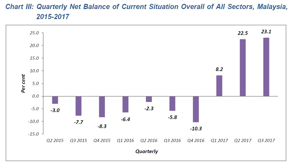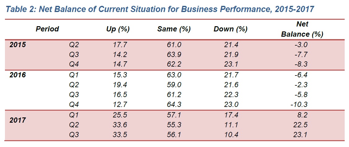 The current situation of business performance in the third quarter 2017 is better with an overall net balance of all sectors +23.1 per cent as compared to +22.5 per cent in the previous quarter. More than half of the establishments (56.1%) reported the current situation of their business to remain the same. Meanwhile, 33.5 per cent of establishments showed improvement in their business climate while, 10.4 per cent of establishments showed less favourable conditions. (Chart III & Table 2).