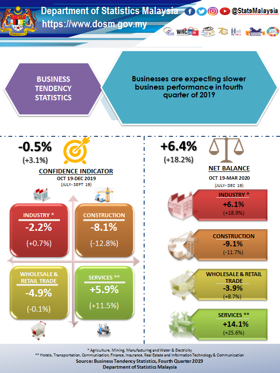 All sectors except Services sector, posted lower confidence indicator in the fourth quarter of 2019. The Construction sector remains negative with the confidence indicator registered -8.1 per cent in the reference quarter. The Wholesale & Retail Trade Sector also shows a decline with the confidence indicator recorded at -4.9 per cent in the fourth quarter compared to -0.1 per cent in the previous quarter. Concurrently, the Industry indicates less favourable, with confidence indicators dropped to -2.2 per cent from +0.7 per cent recorded in the third quarter of 2019.