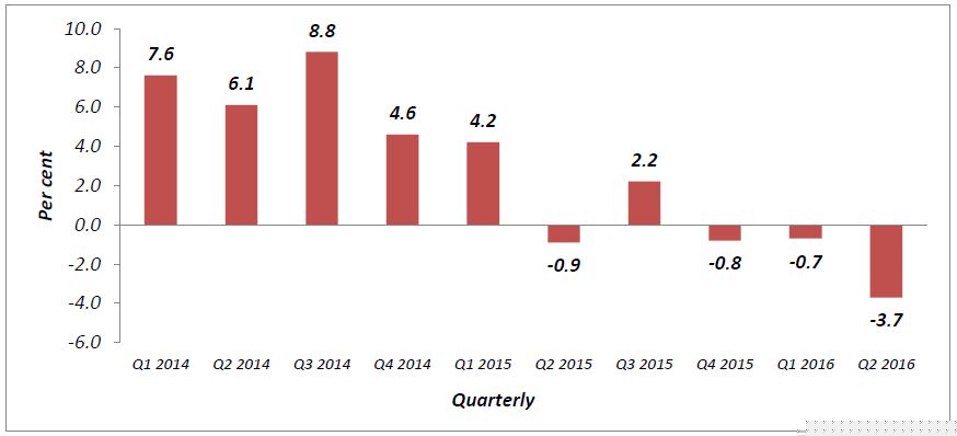 The business performance in the second quarter of 2016 is expected to slow down, as stated by the confidence indicator of -3.7 per cent.