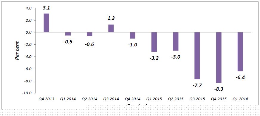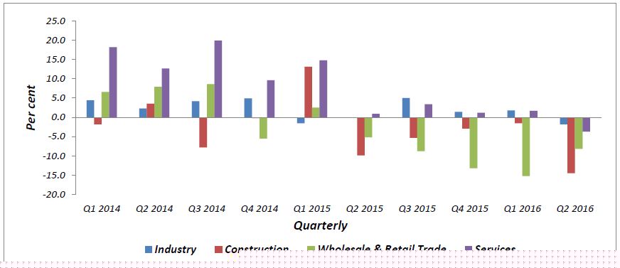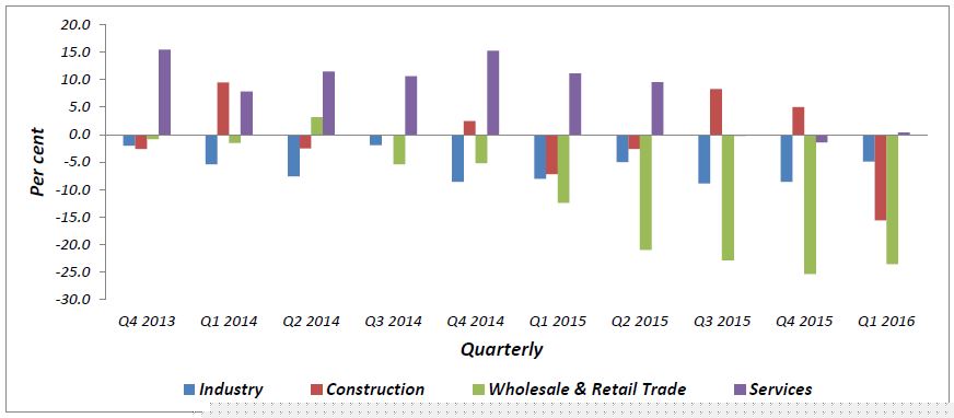 The business performance for all sectors namely construction, wholesale & retail trade, services and industry are expected to decline in the second quarter of 2016 with confidence indicator -14.5 per cent, -8.2 per cent, -3.7 per cent and -1.8 per cent (Chart II).