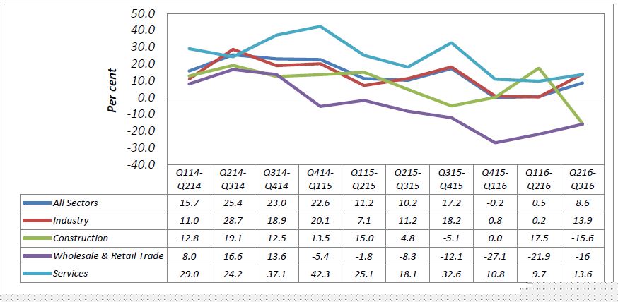 At sector level, business current situation of services showed positive improvement with a net balance of +0.4 per cent as compared to -1.4 per cent in the previous quarter. In contrast, the industry, construction and wholesale & retail sectors have deteriorated during the first quarter 2016 with a net balance of -4.9 per cent, -15.6 per cent and -23.6 per cent respectively (Chart IV).