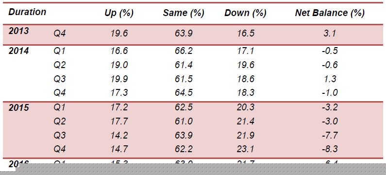 The difference between the percentages of establishments giving favorable and unfavorable response known as the net balance. The expectations for second quarter of 2016 showed an increase in the net balance of +11.4 per cent compared to -0.7 per cent in the previous quarter.