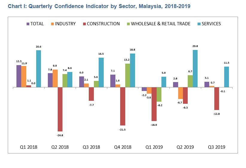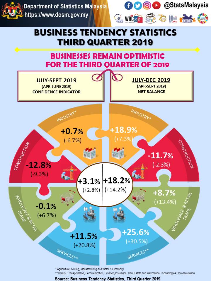 Within the surveyed sectors, Services sector continued as the most optimistic sector, with the confidence indicator recorded at +11.5 per cent in the third quarter 2019. Confidence indicator for Industry sector rebounded to +0.7 per cent in the third quarter of 2019 as compared to -6.7 per cent reported in the previous quarter. Meanwhile, Construction and Wholesale & Retail Trade sectors demonstrated pessimism in the third quarter of 2019 where the confidence indicators registered at -12.8 per cent and -0.1 per cent, respectively.
