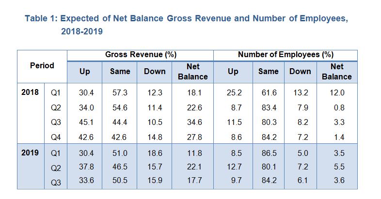 In overall, 33.6 per cent of the respondents expected an increase in gross revenue for the third quarter of 2019 while 15.9 per cent anticipated that their gross revenue to decrease which led to a net balance of + 17.7 per cent.