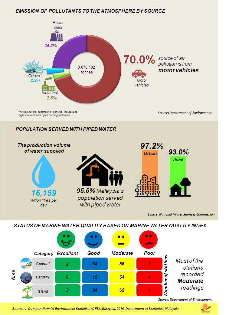 The Compendium of Environment Statistics (CES) presents statistics on environment for the period 2011-2015/2016 by topic namely air, water (inland and marine), land and urban/human settlements. The compilation of this statistics includes environment information, impacts of human activities on the environment and actions taken to minimise the impact. The data sources are obtained from various agencies. Statistics shown are related to the topics of air, water (inland and marine), land and urban/human settlements.