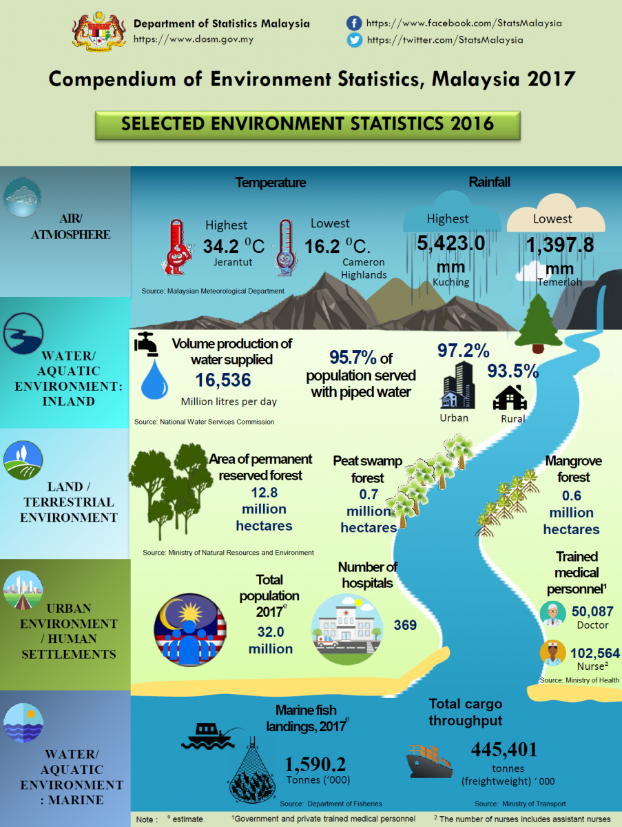 The Compendium of Environment Statistics (CES) presents statistics on environment for the period 2012-2016/2017 namely air, water (inland and marine), land and urban/human settlements. The compilation of the statistics includes environmental information, impacts of human activities on the environment and actions taken to minimise the impact. The data are obtained from various agencies.