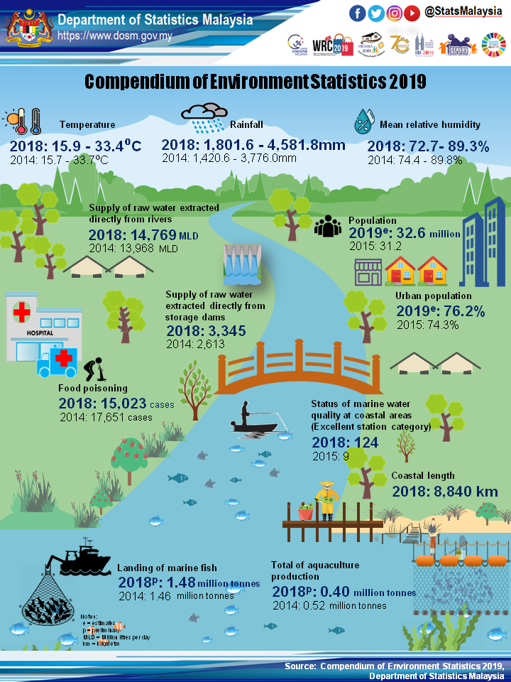 The Compendium of Environment Statistics, Malaysia 2019 presents statistics on six environment components namely Environmental Conditions and Quality; Environmental Resources and their Use; Residuals; Extreme Events and Disasters; Human Settlements and Environmental Health; and Environmental Protection, Management and Engagement. The compilation of this statistics includes environment state and information, impacts of human activities on environment and actions taken to minimise the impact.