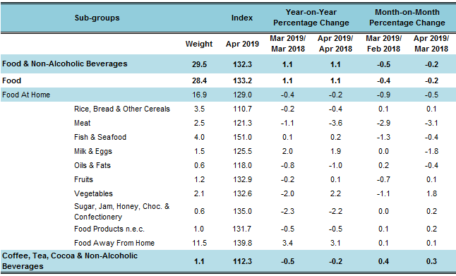 The overall index for Food & Non-Alcoholic Beverages increased 1.1 per cent in April 2019. The increase was attributed by the food sub-group index of Vegetables (+2.2 per cent), Milk & Eggs (+1.9 per cent), Fish & Seafood (+0.2 per cent) and Fruits (+0.1 per cent).