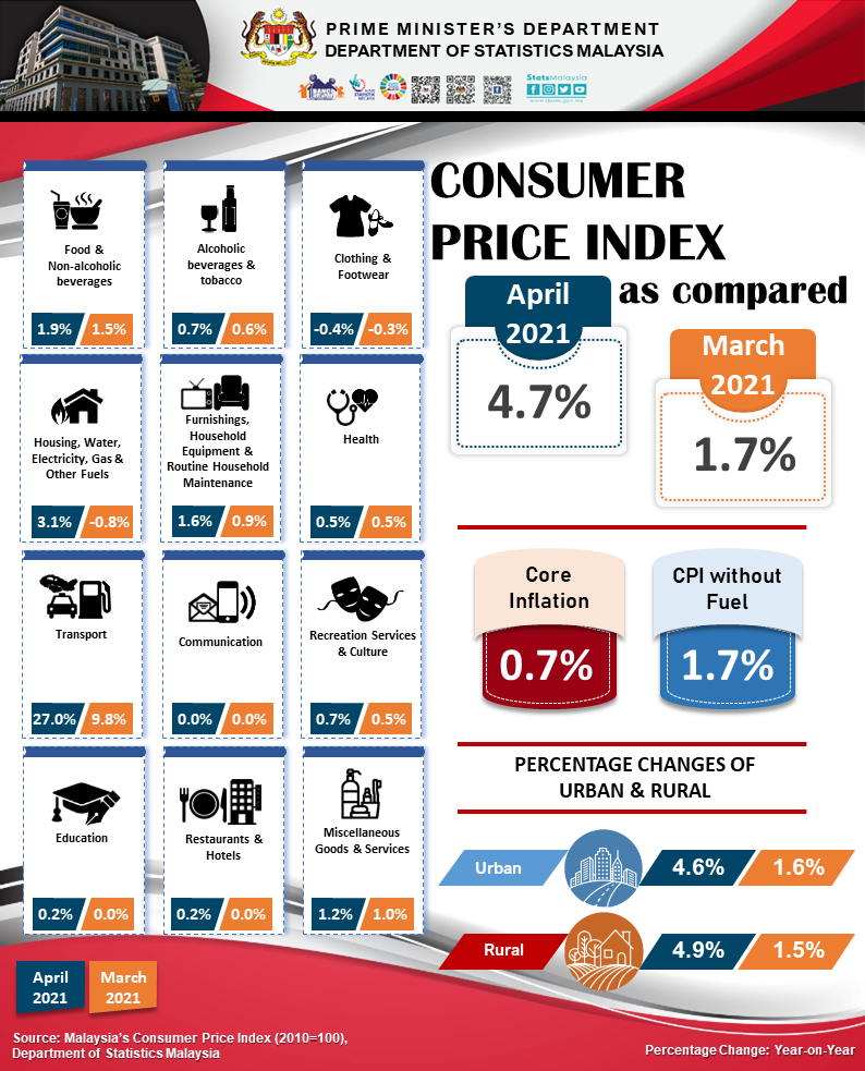 The full publication of the Consumer Price Index Malaysia, April 2021 can be downloaded from eStatistik portal.